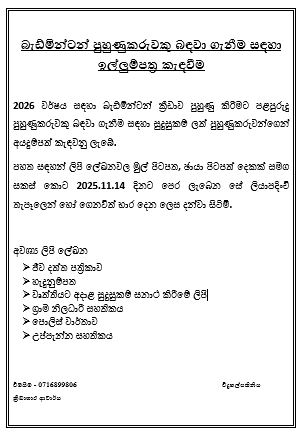 2024 වර්ෂයේ පැවති අ.පො.ස. (සාමාන්ය පෙළ – 2023) විභාගයේ ප්රතිඵල මත පදනම්ව, 2026 වර්ෂයේ පැවැත්වීමට නියමිත අ.පො.ස. (උසස් පෙළ) විභාගය සඳහා බාහිර පාසල් වලින් නවක සිසුන් ඇතුලත් කරගැනීමට අදාළ අයදුම් පත්රය ඉහත දැක්වේ.